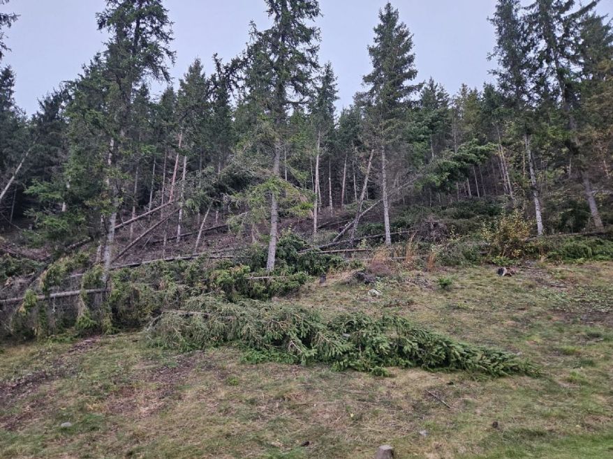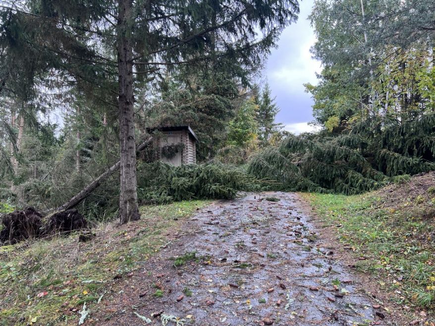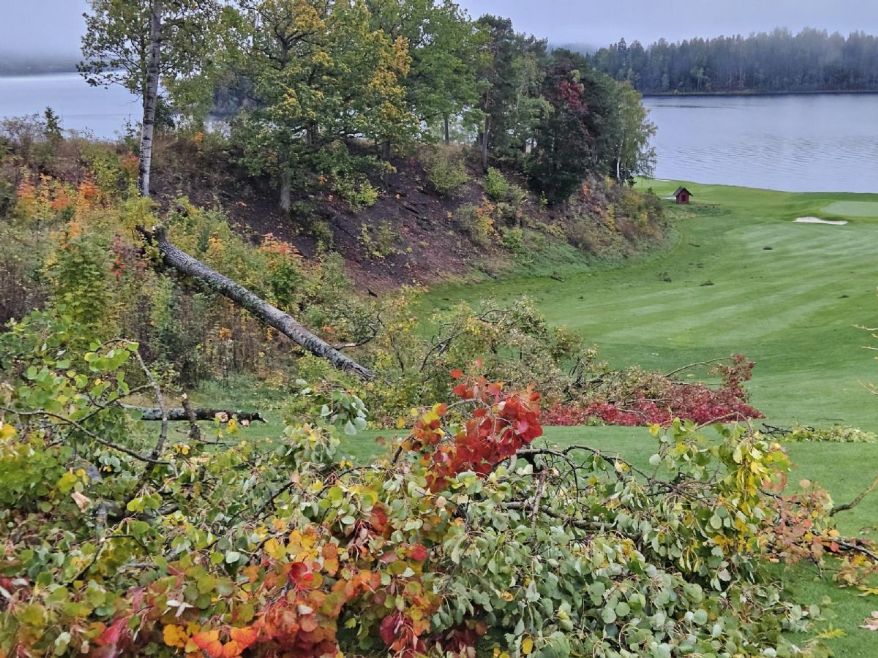 Etter at stormen Amy traff Tyrifjord i helgen, har banen fått både omfattende vannmengder og vindskader. Totalt har vi fått nær 60 mm regn, og bakken er nå helt mettet av vann. Flere trær har falt, og veien mellom hull 7 og 8 er foreløpig blokkert.