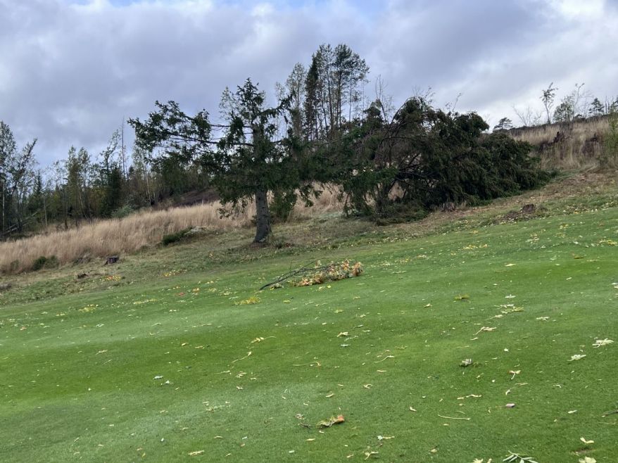Etter at stormen Amy traff i helgen, har banen fått både omfattende vannmengder og vindskader. Totalt har vi fått nær 60 mm regn, og bakken er nå helt mettet av vann. Flere trær har falt, og veien mellom hull 7 og 8 er foreløpig blokkert.